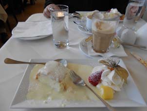 2015年2月28日(土)明日から3月 実は3月3日の雛祭りは私の誕生日です。みんながすぐ覚えてくれて、メールやカードや、愛らしいお内裏様セットを送ってくれるのがとても嬉しく、3月3日に生まれてよかった!と飛び跳ねたい気持ち。先日、友人が、とてもとても愛らしいお内裏様をプレゼントしてくれたので、さっそく写真に撮りましたが、アップしようとしたら、どうもうまく行きません。そこでまたまたダニエルくんに来てもらうことに。ちっともちゃんと身につけられないでお恥ずかしい限りなのですが、仕方がありません。今度の時はここの次はここをクリックして、というだけではなくて、ここをクリックするというのは、何をしているのか、そのプロセスの意味を教えてもらおうと思います。そうすれば、ここをクリックしても、なるはずの状況にならない時でも、何が悪いのか、どうすればよいのかが、自分で直せないにしても、せめてその意味はわかるようになるのではないかしら。 私は今、ここをこうするためにこうしているんだ、ということが分かれば、覚えやすくもなるのでは、と思っています。では、月曜日の再レッスンに乞うご期待! 2015年2月25日(水)メガネ作り 眼鏡屋さんはとても丁寧にアドバイスしてくれ、普通用には縁なしの軽くて繊細でモダンな感じのメガネを、読書用には赤系の楽しい感じのメガネを選びました。普通用メガネの柄の色は、「あなたの茶色の目にはグリーンがとても映りがいいんですよ」とか、読書用メガネの縁の色は、「あなたの黒い髪には赤系の縁がとてもよく合います」とか、日本ではありえないアドバイスが聞けたのが興味深いと思いました。だって日本人だったら髪の色も目の色も同じですから、色映りを考えることはないですものね。10日くらいでできるそうなので、どんな感じになるのかな、と楽しみです。 帰りは、久しぶりにヴィルヘルミーネの丘にあるお城のカフェに寄りました。雨がちで寒くて、空もどんよりと曇っていましたが、チーズパイのバニラソースがけとカフェ・ラテのおやつがとてもおいしくて、幸せな気持ちになりました。 チーズパイのバニラソース添え